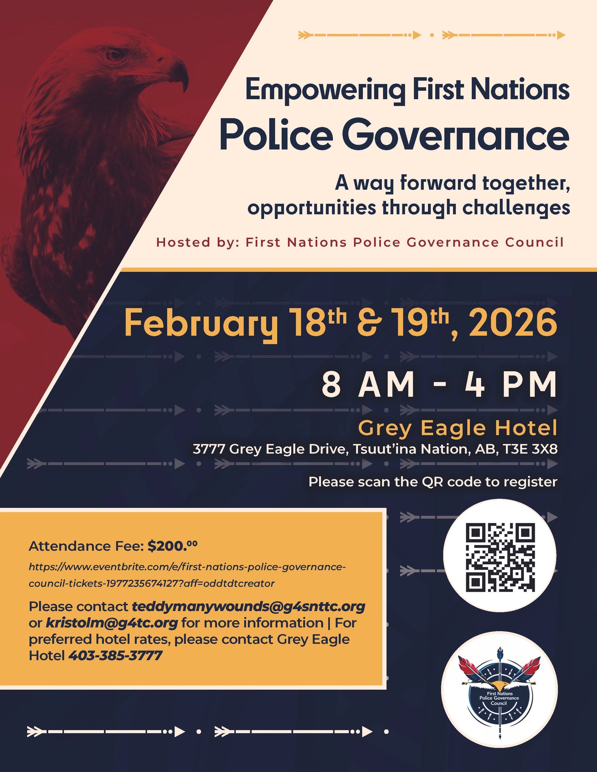 Please call the Grey Eagle hotel before February 1, 2026, for preferred room rates. This conference is open to all public safety professionals, police governance professionals, and those who wish to learn more from First Nations police governance professionals